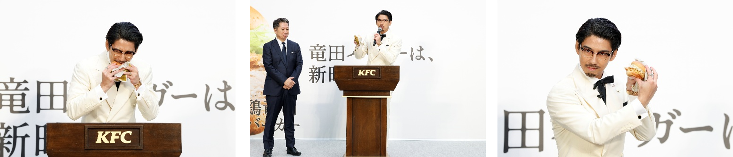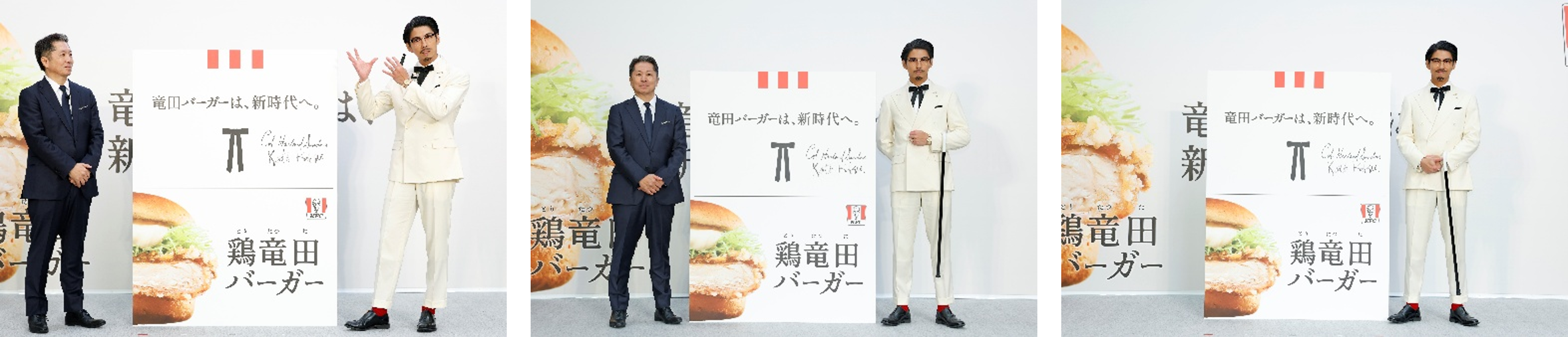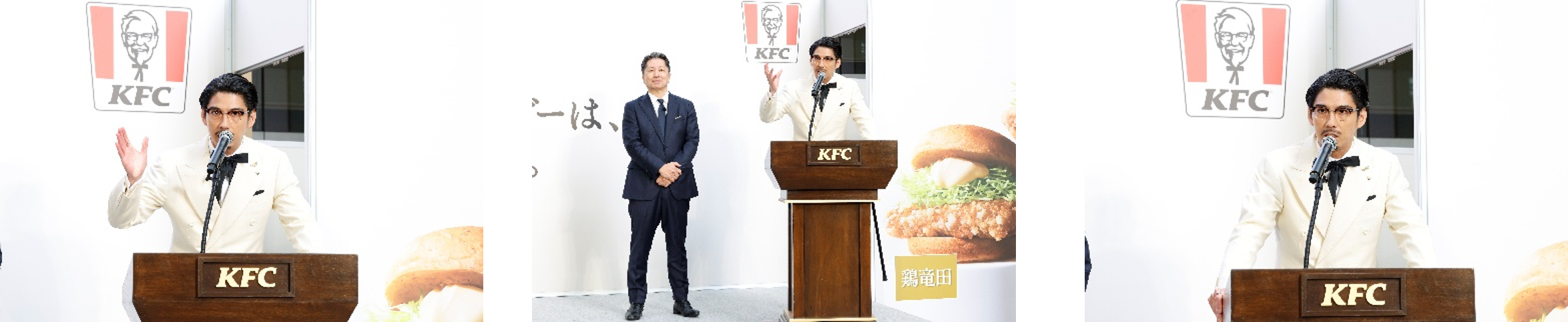 ゲストとして登壇した賀来賢人さんは、カーネル・サンダースの衣装に身を包んで登場し、会場を沸かせました。CMでもおなじみのキャラクターとして、「ケンタの鶏竜田バーガー」の魅力をプレゼン。さらに賀来さんは、「オリジナルチキンに負けないような、新たな竜田とKFCの融合」「世界中の皆さまにお披露目できるのがうれしい!」と自ら太鼓判を押し、その言葉に会場の新商品への期待は一段と高まりました。