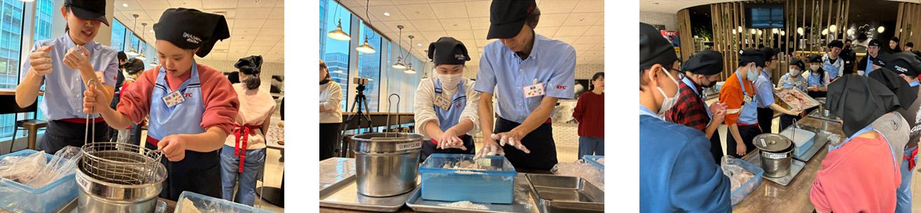 ・「オリジナルチキン」の調理体験:チキンへの粉付け作業を体験し、チキンを揚げる工程を見学